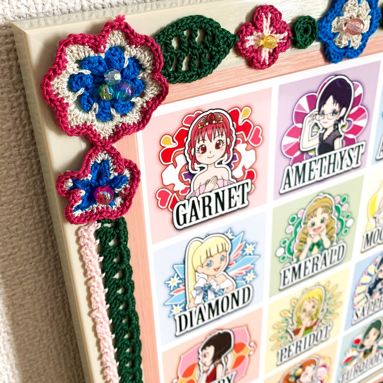かぎ針編みのモチーフを額縁と合わせ、華やかさもプラスしています。