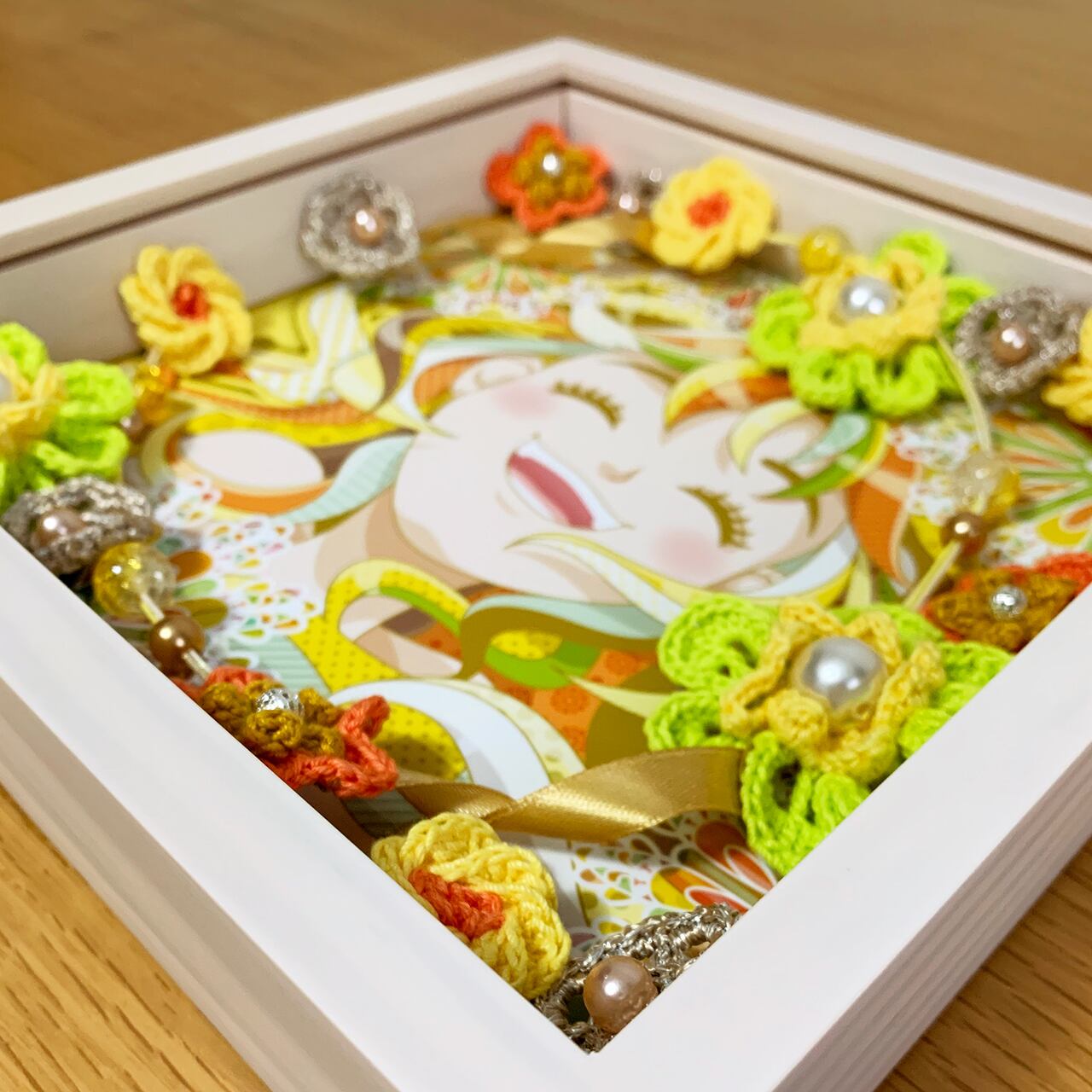 デジタルイラストとかぎ針編みを組み合わせた、立体額装作品です。