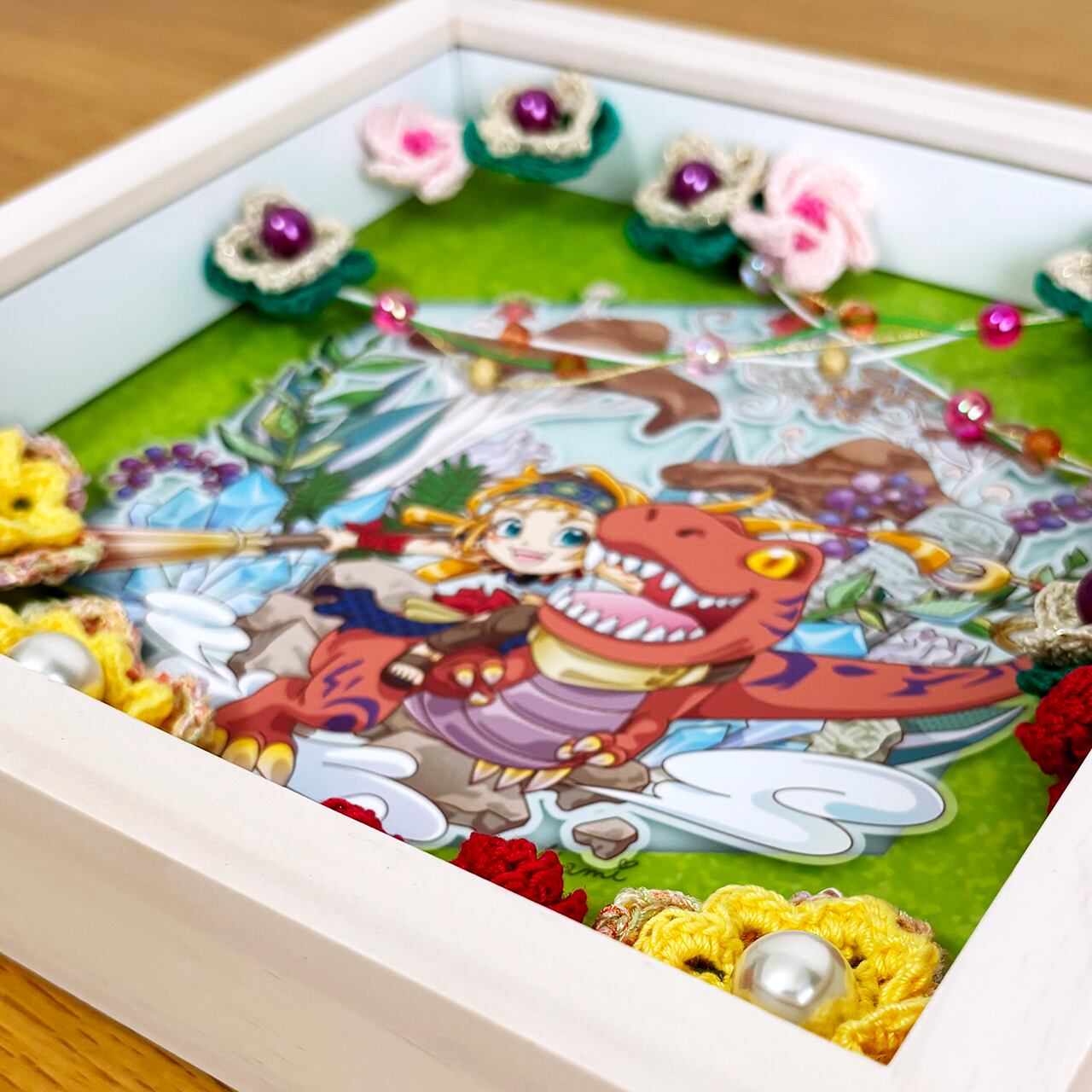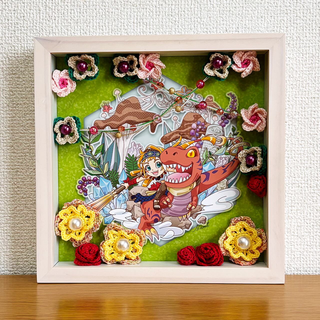 デジタルイラストとかぎ針編みを組み合わせた、立体額装作品です。