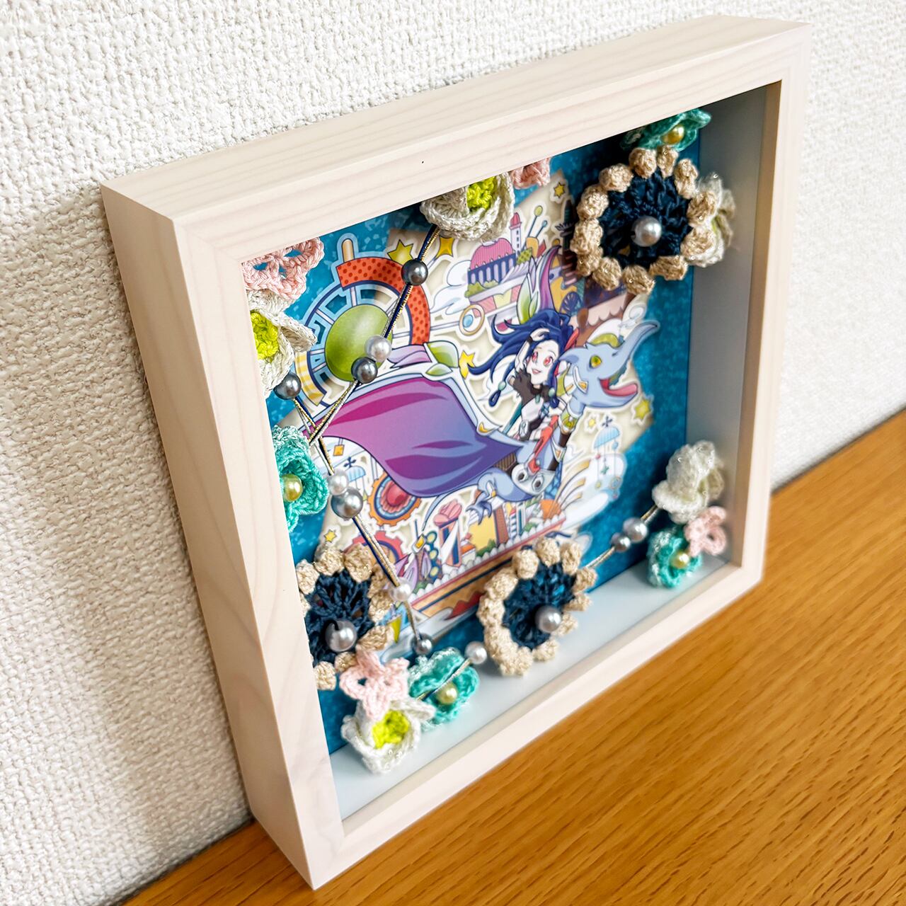 デジタルイラストとかぎ針編みを組み合わせた、立体額装作品です。
