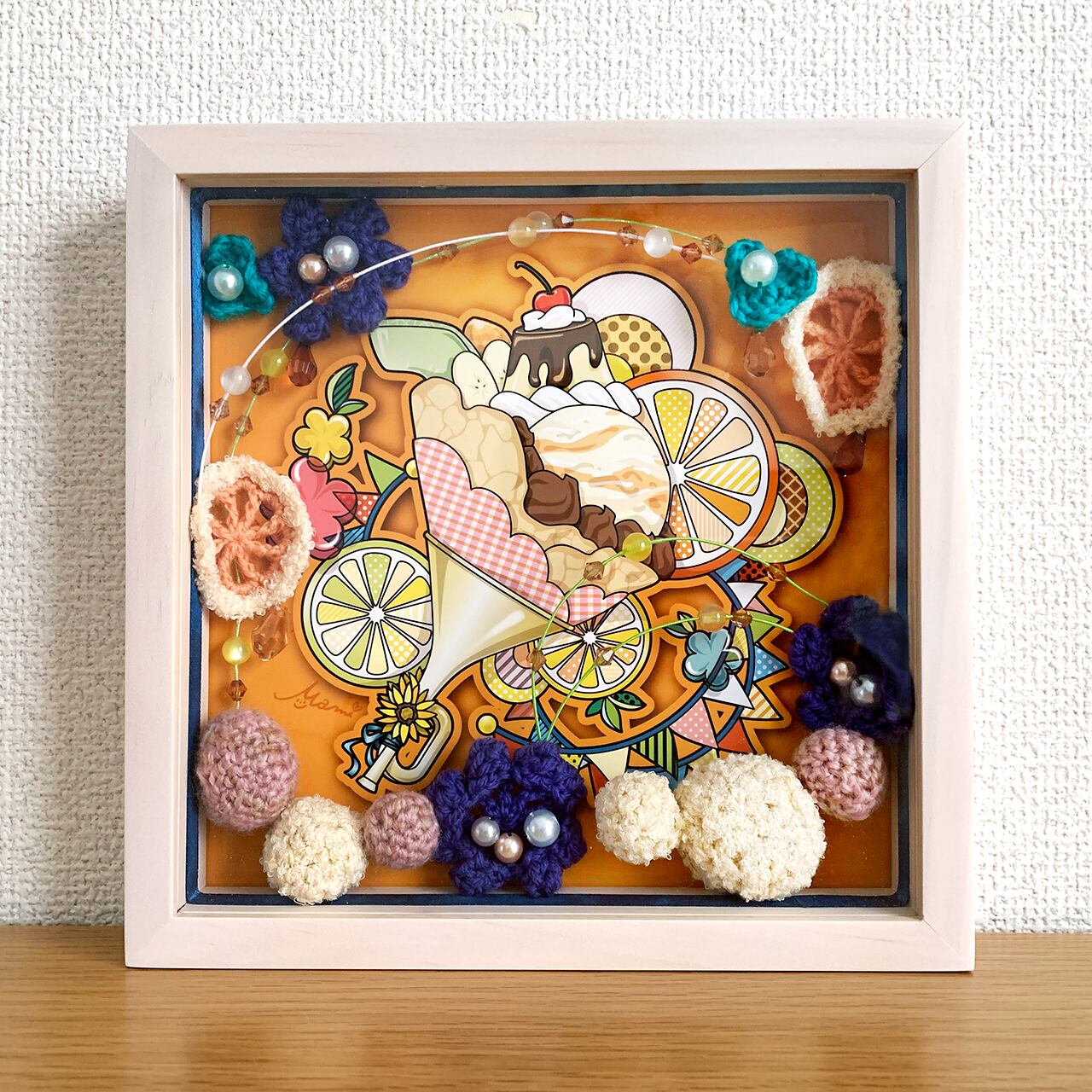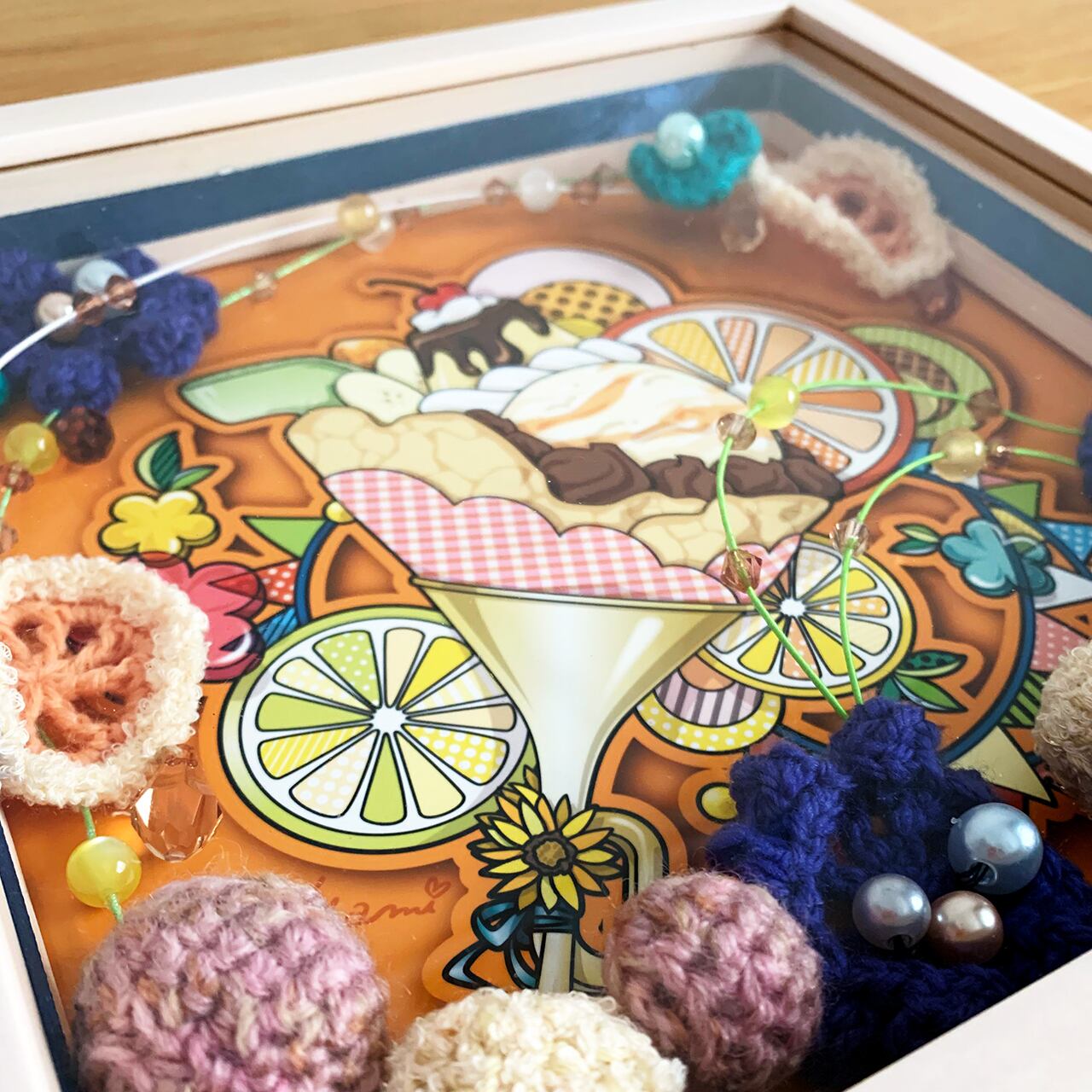 デジタルイラストとかぎ針編みを組み合わせた、立体額装作品です。